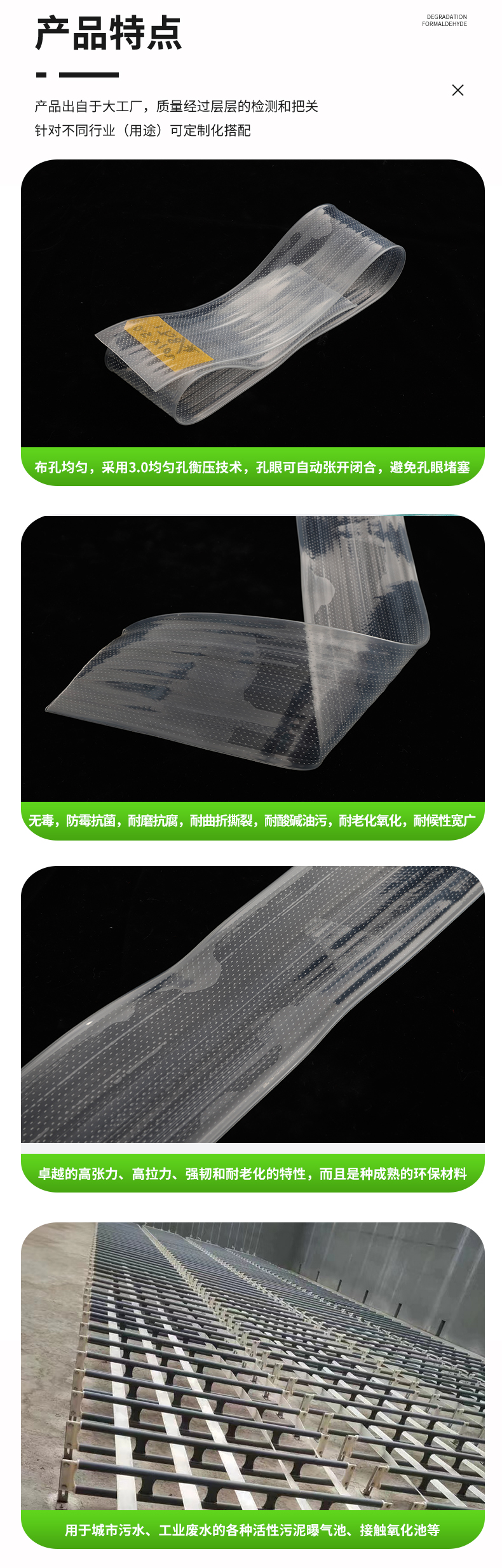 曝氣軟管是引進(jìn)西德技術(shù)開發(fā)成功的新型增氧曝氣器。薄壁、直通道極大降低了曝氣阻力損失;可變孔及狹縫自動(dòng)開閉,徹底解決了曝氣器的堵塞問題;軟管為線狀曝氣,使布?xì)饩鶆颍⑿纬韶Q向環(huán)流,攪拌混合更均勻;氣泡小,氧利用率和動(dòng)力效率高。
