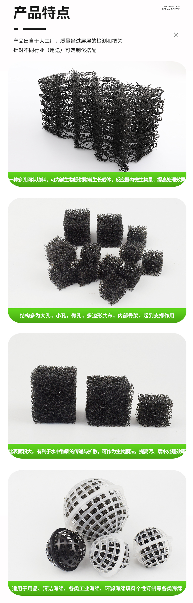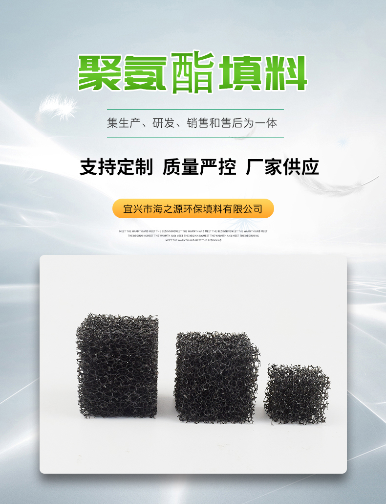 聚氨酯填料作為一種多孔網(wǎng)狀填料,可為微生物提供附著生長載體,反應器內(nèi)微生物量,提高處理效果。聚氨酯填料孔隙為網(wǎng)狀,內(nèi)部具體結構多為大孔,小孔,微孔,多邊形共布,通過經(jīng)絡使得面與面相交,且構成填料的內(nèi)部骨架,起到支撐作用。。聚氨酯填料相比其他填料具有較大的比表面積,孔隙率可達95%以上,有利于水中物質的傳遞與擴散,可作為生物膜法,提高污、廢水處理效率,是一種較為理想的生化污水處理填料。