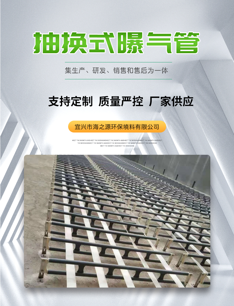 抽換式無骨微孔曝氣管由軟彈性高分子混合物(PEC-SF)經(jīng)特殊工藝制成,ABS專用固定調(diào)節(jié)支架,專用彈簧、堵塞接,不銹鋼專用卡箍等組成。
