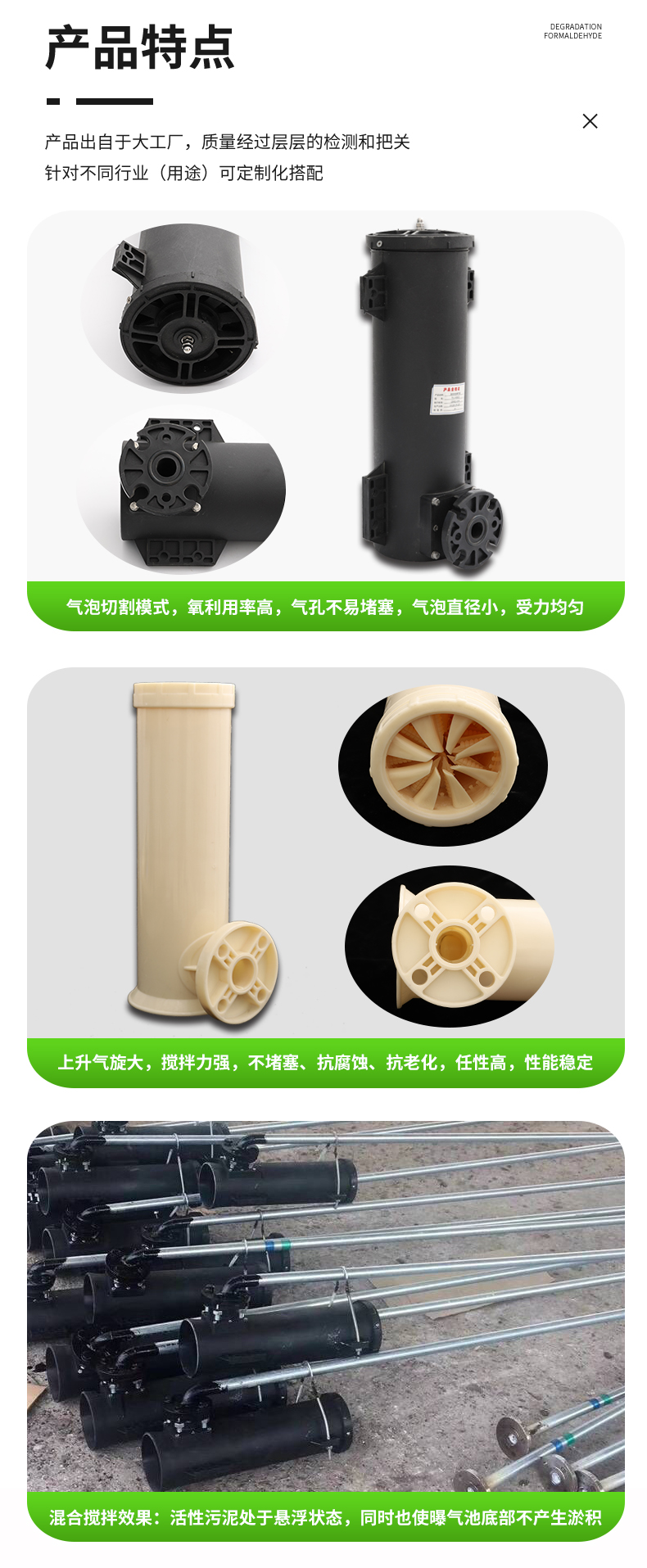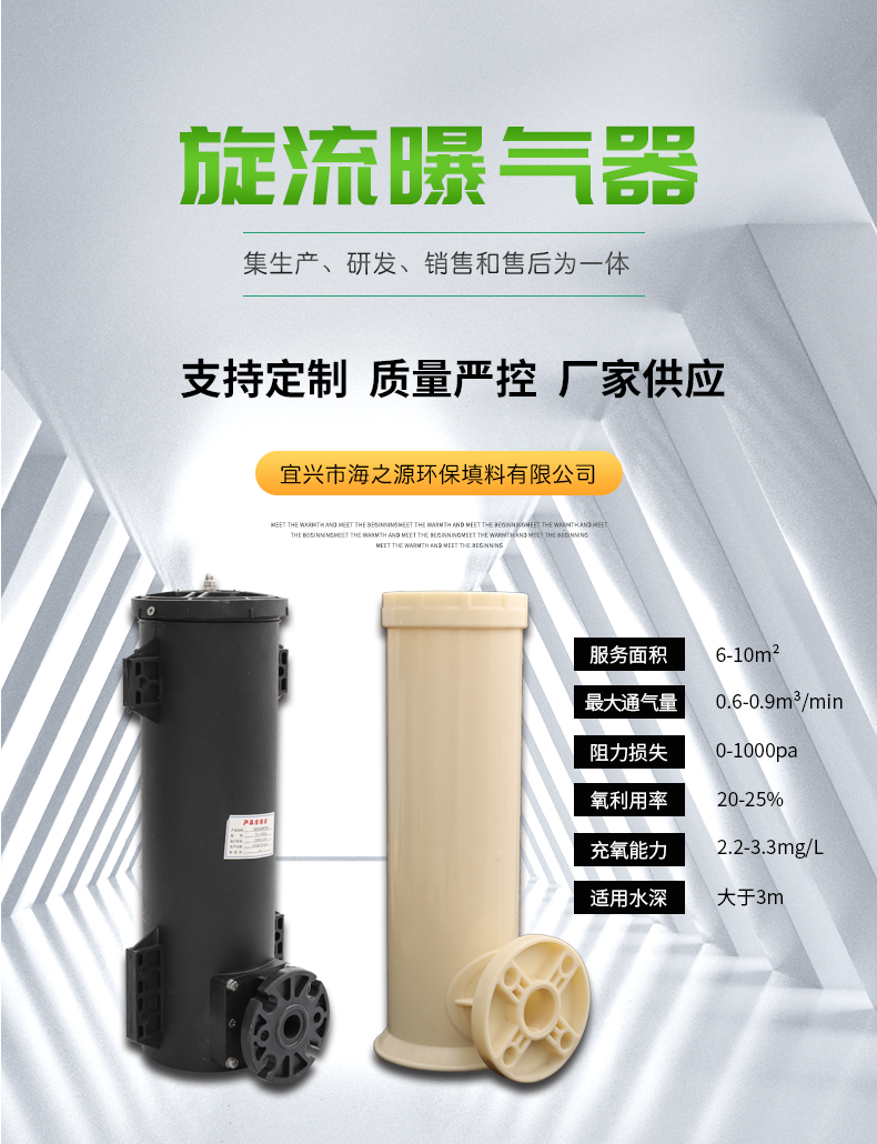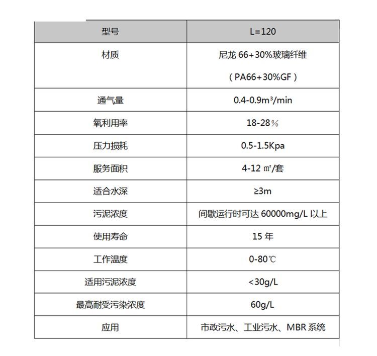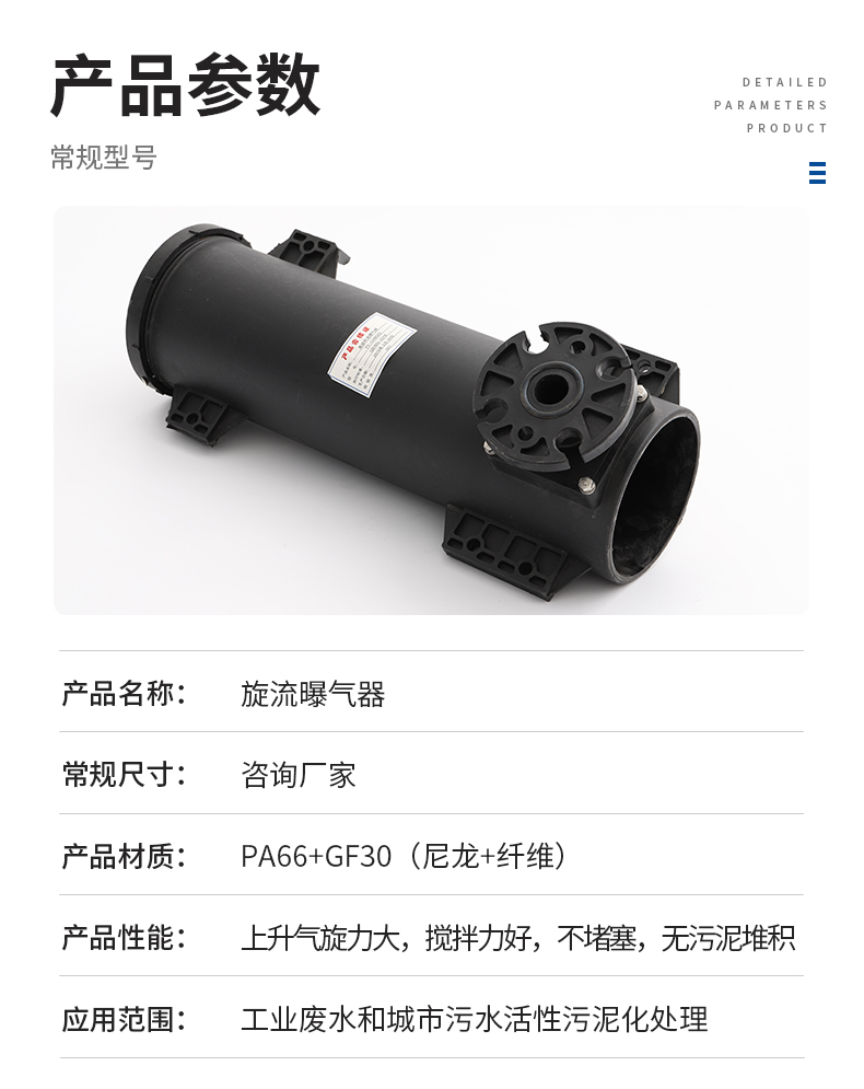 可升降旋流曝氣器整體由尼龍66+30%玻璃纖維制成,,具有較高的耐腐蝕性。其高度為42厘米,內(nèi)徑為12厘米,進氣口中心距曝氣頭底部5厘米。