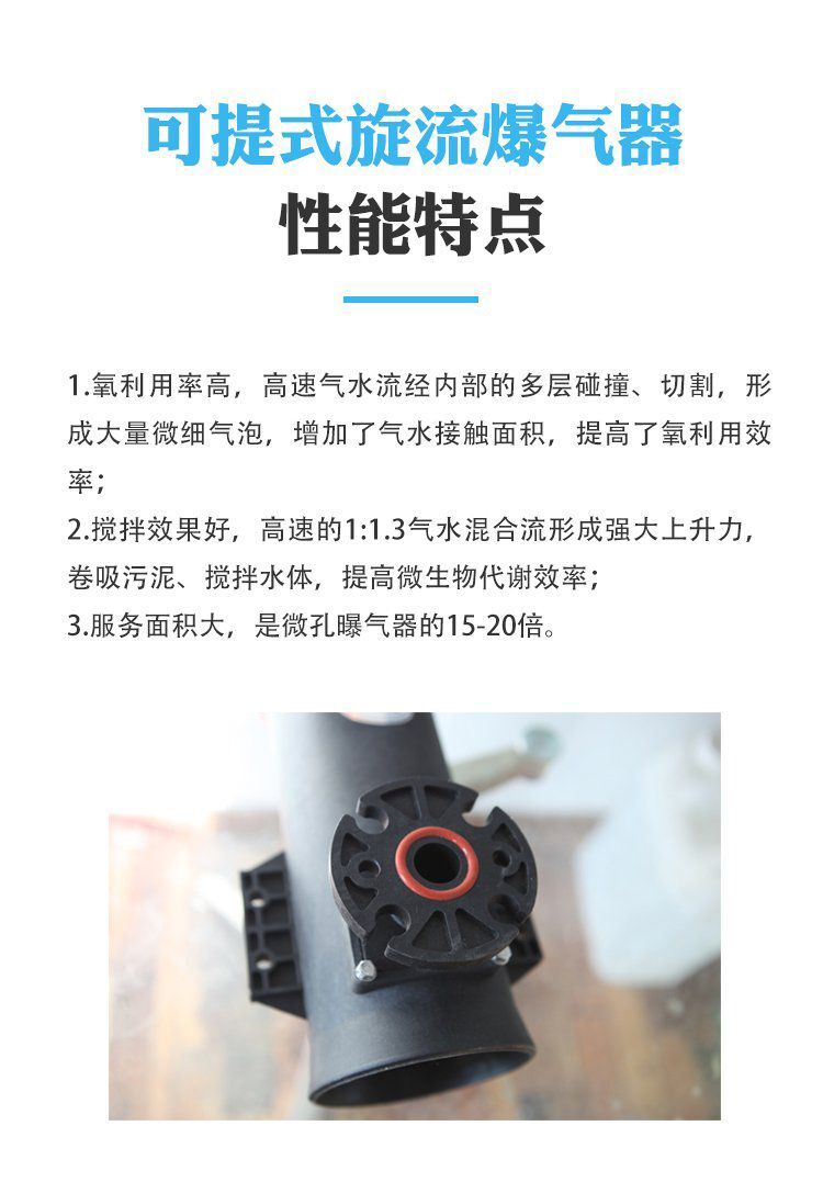 旋流曝氣器主要由外筒、進氣管、回流板、楔形結(jié)構(gòu)四部分組成,可提升旋流曝氣器溶氧效率高,壓力損失小,攪拌能力強,不堵塞,池底不積泥,,免維護,間歇運行,使用壽命長;與傳統(tǒng)的螺旋曝氣器、發(fā)散式曝氣器、穿孔管曝氣器相比,可升降旋流曝氣器的能耗可降低25%以上。