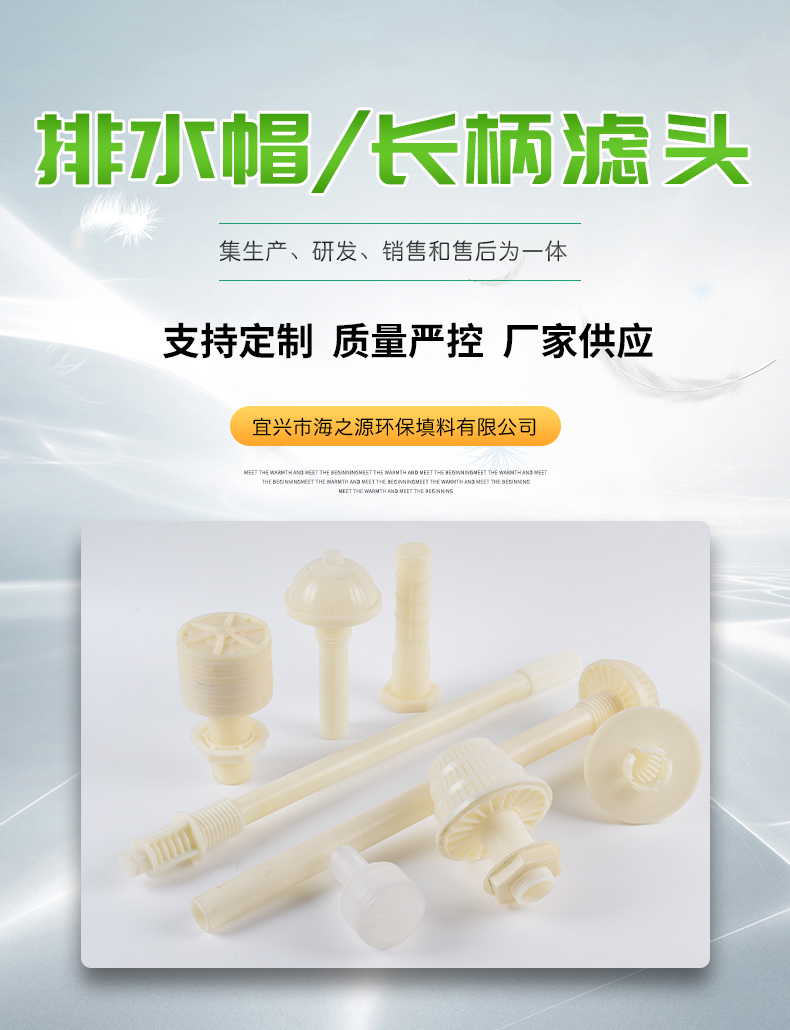 濾頭又叫濾帽,用在濾池配水系統(tǒng)和過濾器中。反沖洗濾頭包括排水帽、濾水帽兩種,均采用ABS工程塑料制成,結(jié)構(gòu)合理,連接牢固,承壓強(qiáng)度高,縫隙不變型,使用效果好,既能防止陰陽樹脂外流,又能保證流量。適用于濾池汽水反沖洗系統(tǒng)和軟化水質(zhì)組合式,壓力式,回程式及離子交換器等水處理設(shè)備的過濾裝置。