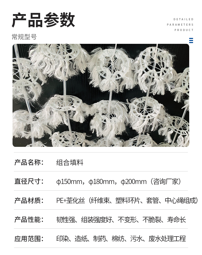 組合填料是在軟性填料和半軟性填料的基礎(chǔ)上發(fā)展而成的,它兼有兩者的優(yōu)點(diǎn)。其結(jié)構(gòu)是將塑料圓片壓扣改成雙圈大塑料環(huán),將醛化纖維或滌綸絲壓在環(huán)的環(huán)圈上,使纖維束均勻分布;內(nèi)圈是雪花狀塑料枝條,既能掛膜,又能有效切割氣泡,提高氧的轉(zhuǎn)移速率和利用率。使水氣生物膜得到充分交換,使水中的有機(jī)物得到高效處理。
