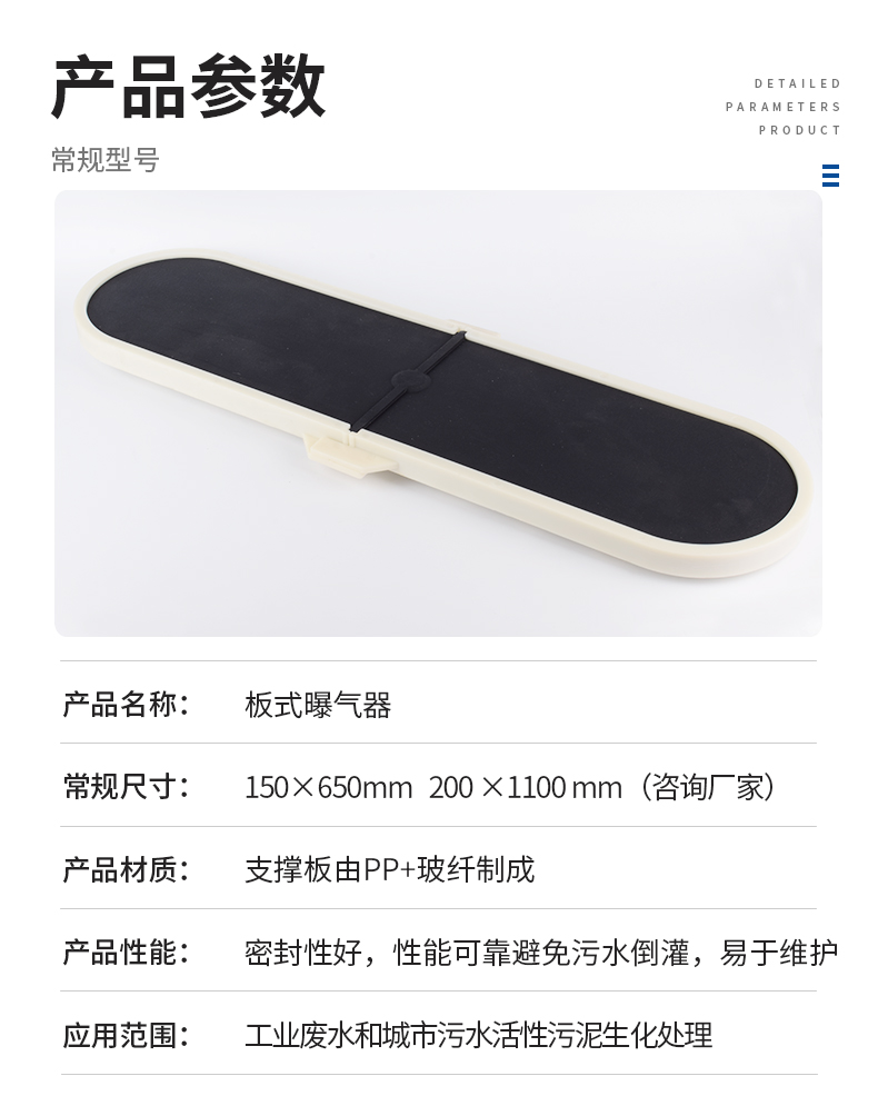 板式曝氣器設(shè)計結(jié)構(gòu)使曝氣器系統(tǒng)在較寬的工作氣量范圍內(nèi)保持低能耗、高效率;開孔方式,在鼓風機工作的過程中,曝氣器產(chǎn)生的氣泡均勻,達到很好的蓮花效應(yīng);該曝氣即可用于間歇運行系統(tǒng),又可用于連續(xù)曝氣系統(tǒng),具有氧利用率高,性能可靠,曝氣器具有自動止回功能,有效防止污水倒灌,使用壽命長等特點。